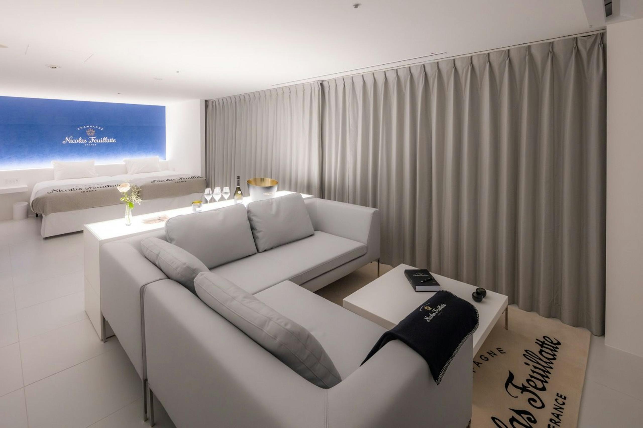 2024年1月開業の世界初のオフィシャル・シャンパン・ホテル。シャンパンを片手にプロジェクターでNetflixを楽しむ。